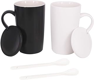 BPFY 16オンス セラミックコーヒーマグ 蓋とスプーン付き ミルクカップ クラシックマグ お茶、コーヒー、ココア、黒と白の結婚またはカップル用 (16オンス)