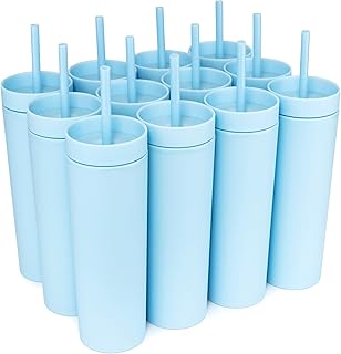 SKINNY タンブラー(12個パック) マットカラー アクリル タンブラー 蓋とストロー付き | スキニー 16オンス ダブルウォールプラスチックタンブラー 無料のストロークリーナー付き!再利用可能なカップ ストロー付き | DIYギフト(ペリウィンクルブルー)