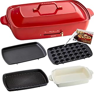 BRUNO ブルーノ コンパクトホットプレート 本体 プレート3種(たこ焼き セラミックコート鍋 平面) スチーマー レシピブック付き レッド Red 赤 おしゃれ かわいい これ1台 蓋 ふた付き 1200w 温度調節 洗いやすい 1人 2人 3人 用 小型 小さいサイズ 少人数用 ひとり暮らしにも BOE021-RD 1700474
